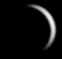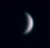 Die Bilder entstanden jeweils durch Okularprojektion. Bei den Bildern von 1999 und 2001 verwendete ich das 150mm Spiegelteleskop. Die Belichtungszeit beträgt jeweils 1/8 s auf 1600 ASA. Dabei ist das Bild von 2001 leider stark überbelichtet worden. Die übrigen Bilder habe ich mit der Hi8 - Kamera aufgenommen und davon jeweils mehrere Einzelbilder addiert. Das Bild von 2002 nahm ich durch den 63mm - Refraktor auf. Bei den Bildern von 2004 verwendete ich das 250mm SN - Teleskop. Einzelheiten in der dichten Wolkendecke konnte ich bisher durch mein Fernrohr nicht erkennen. Lediglich auf Bildern von Venussonden sind Strukturen der Wolken zu sehen. |