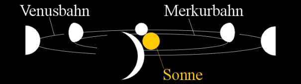 In der Skizze unten ist dargestellt, wie die Größenunterschiede und Phasen zu Stande kommen. Auf ihrer Bahn kommt die Venus der Erde zeitweise näher und erscheint damit größer. Je nach Winkel zwischen Sonne, Venus und Erde sehen wir nur einen Teil der beleuchteten Oberfläche. ( Gilt auch für Merkur )