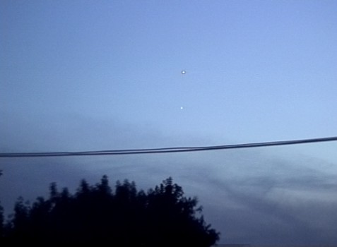 Die beiden Planeten haben hier einen Abstand von nur etwa 2°. Einen Tag zuvor war der Abstand noch geringer - leider spielte das Wetter nicht mit und eine Beobachtung war nicht möglich. Aufnahme mit Hi8 - Kamera |
