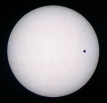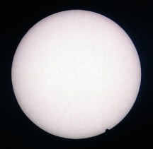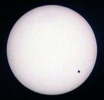 Die Beobachtungsbedingungen an diesem Tag waren sehr gut. Der gesamte Verlauf des Transits konnte prima beobachtet werden. Diese vier Bilder sind nur eine kleine Auswahl. Ich habe sie mit dem 62/840 mm Refraktor aufgenommen. Als Filter verwendete ich Mylarfolie. Die Belichtungszeit betrug jeweils 1/30 s auf 100 ASA. Nach der Auswertung des Materials (über 80 Fotos und einige Videosequenzen, durch drei Teleskope aufgenommen) habe ich eine neue Seite zusammengestellt, auf der weitere Bilder und Videos zu sehen sind. Hier die Ergebnisse: |