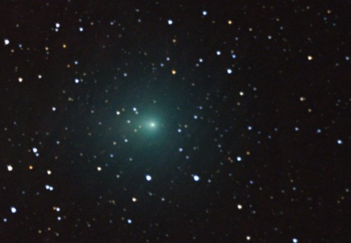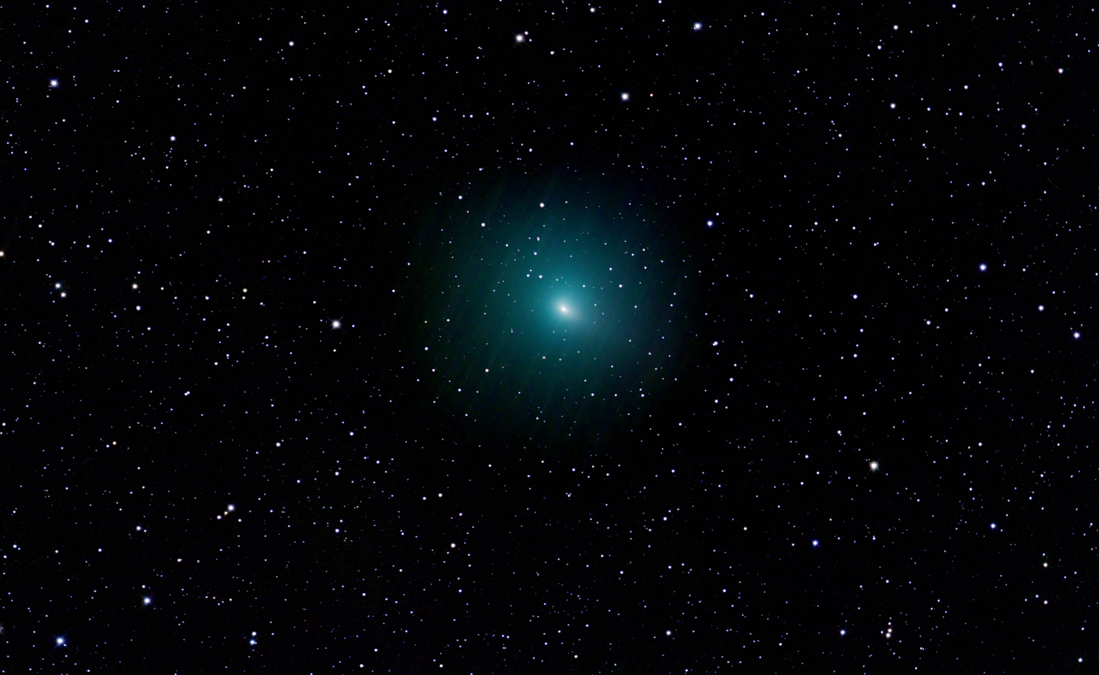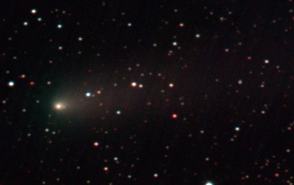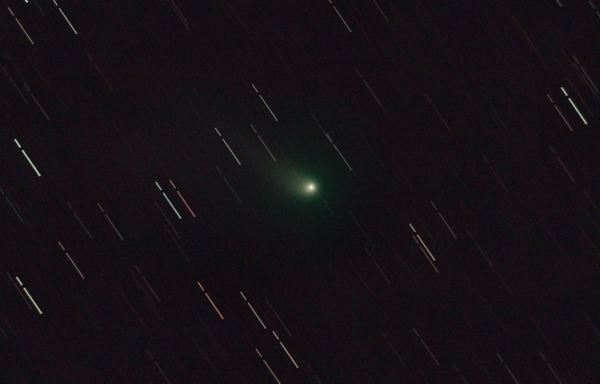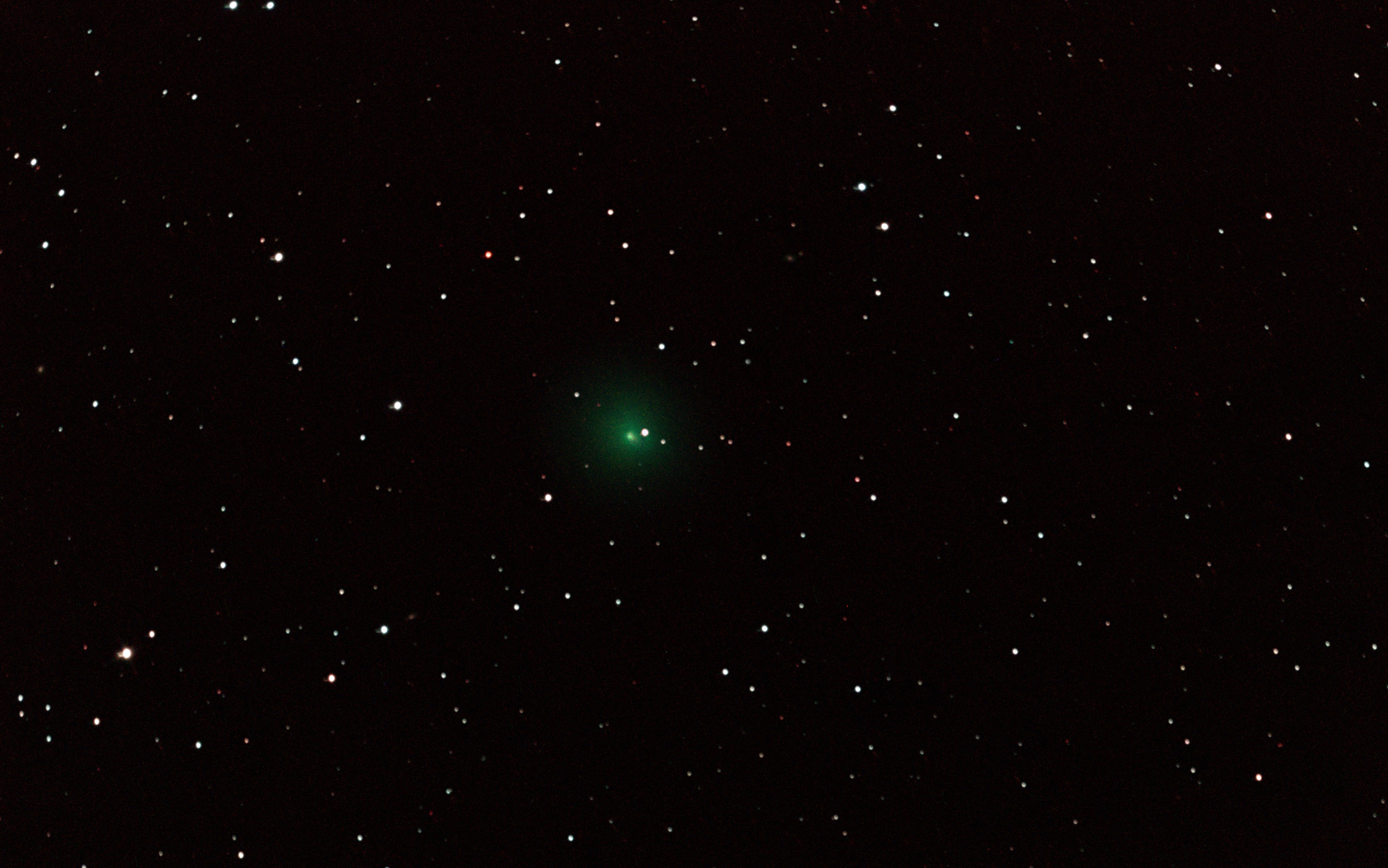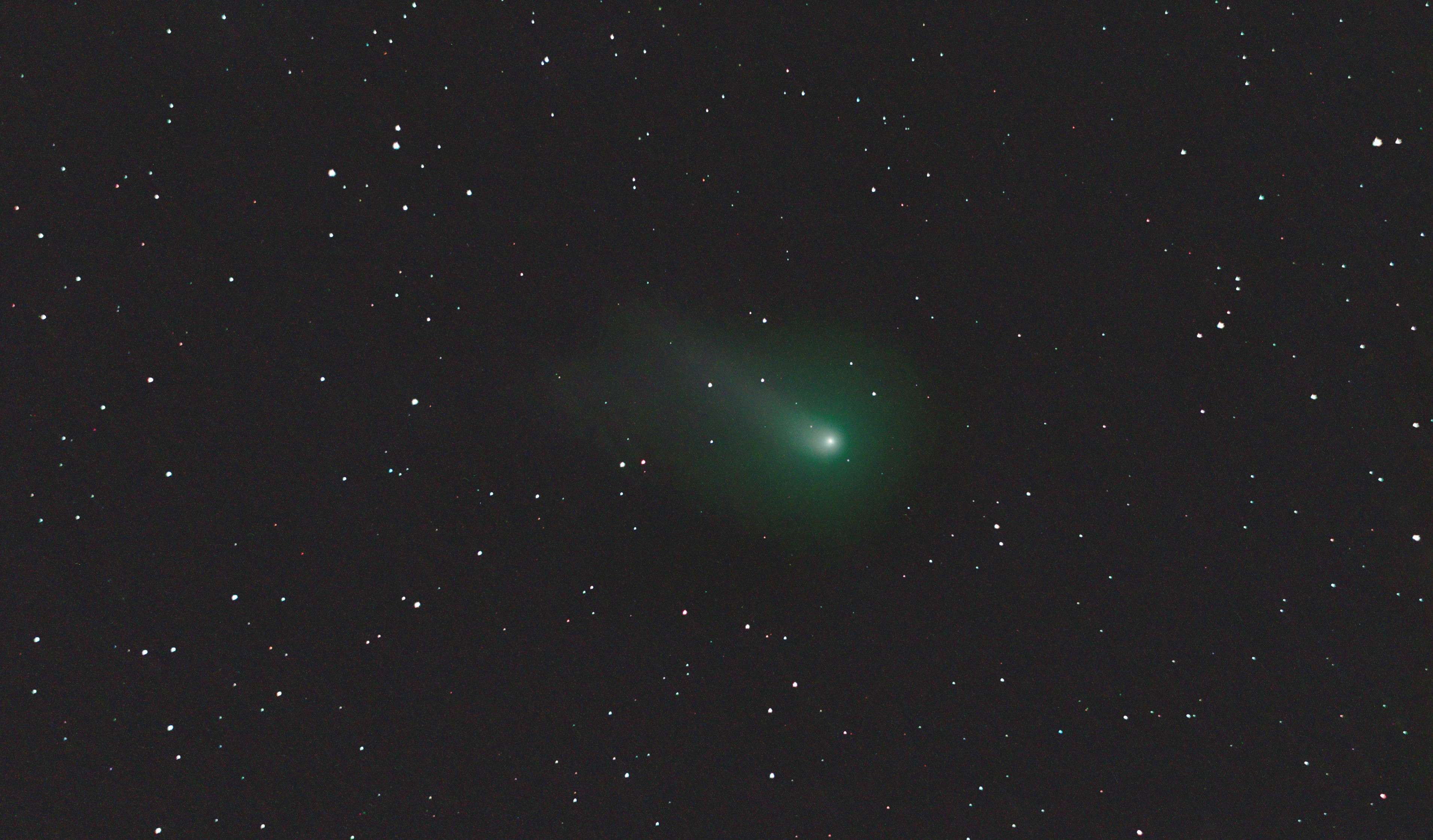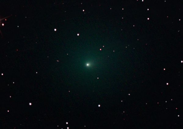 Dieser kurzperiodische Komet ist einer der wenigen, der die Erwartungen deutlich übertroffen hat. Bei der prognostizierten Helligkeit von 10m bis 11m ist es nicht geblieben. Diese stieg auf deutlich mehr als 6m an, sodass dieser Komet sogar ein Fernglasobjekt wurde. Hinzu kam, dass er bei langsam abnehmender Helligkeit nahezu die ganze Nacht zu beobachten war. Leider gibt es aber auch eine weniger gute Nachricht. Die Helligkeit verteilte sich über eine sehr große Fläche. So war der Komet im Fernglas nur als schwach sichtbares, diffuses Nebelwölkchen zu erkennen. In der lang belichteten Aufnahme ist die Ursache zu sehen. Die Koma ist riesig, wahrscheinlich noch viel größer, als in der Aufnahme sichtbar. Der winzige Schweif ist darin kaum auszumachen.