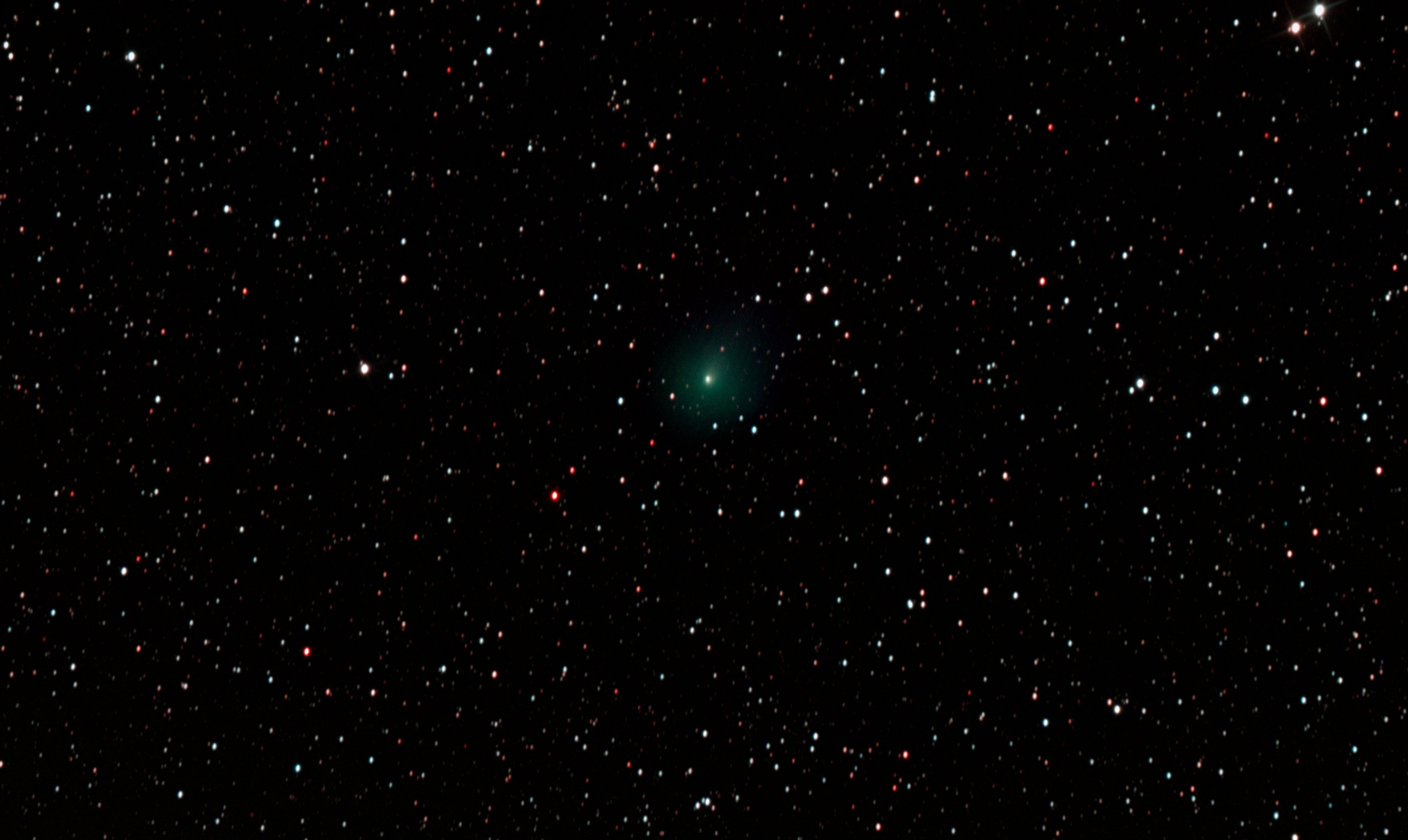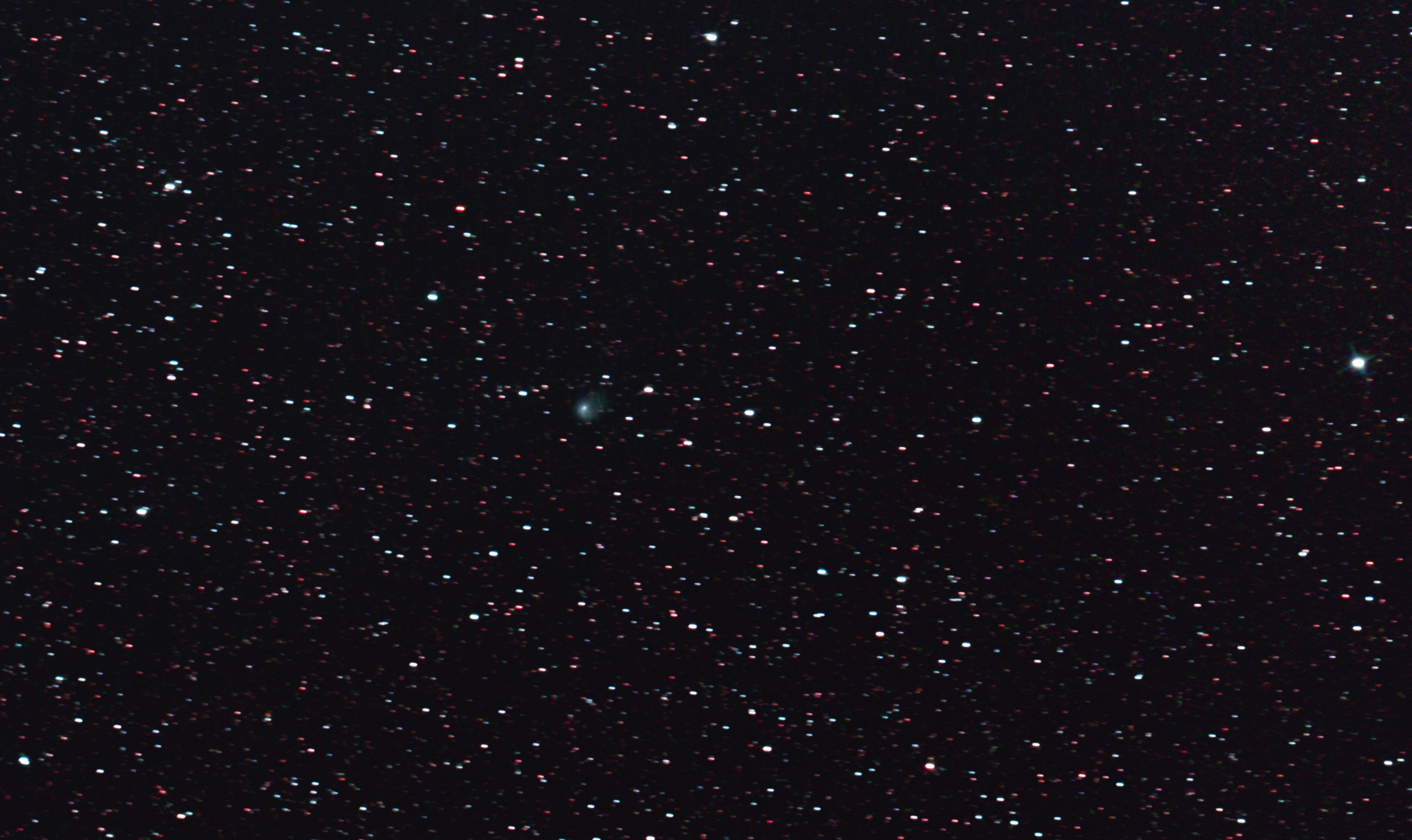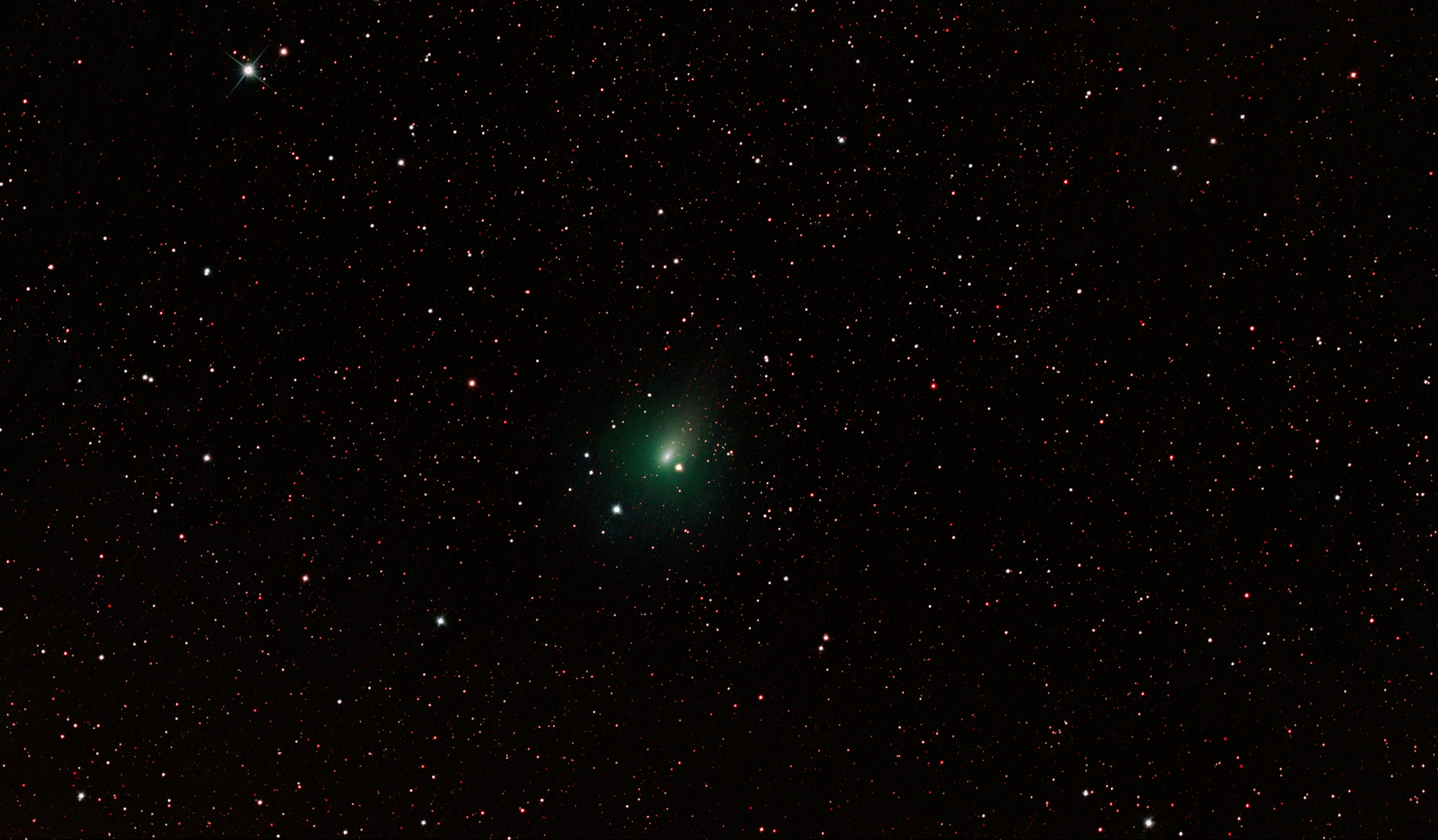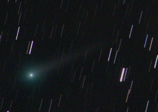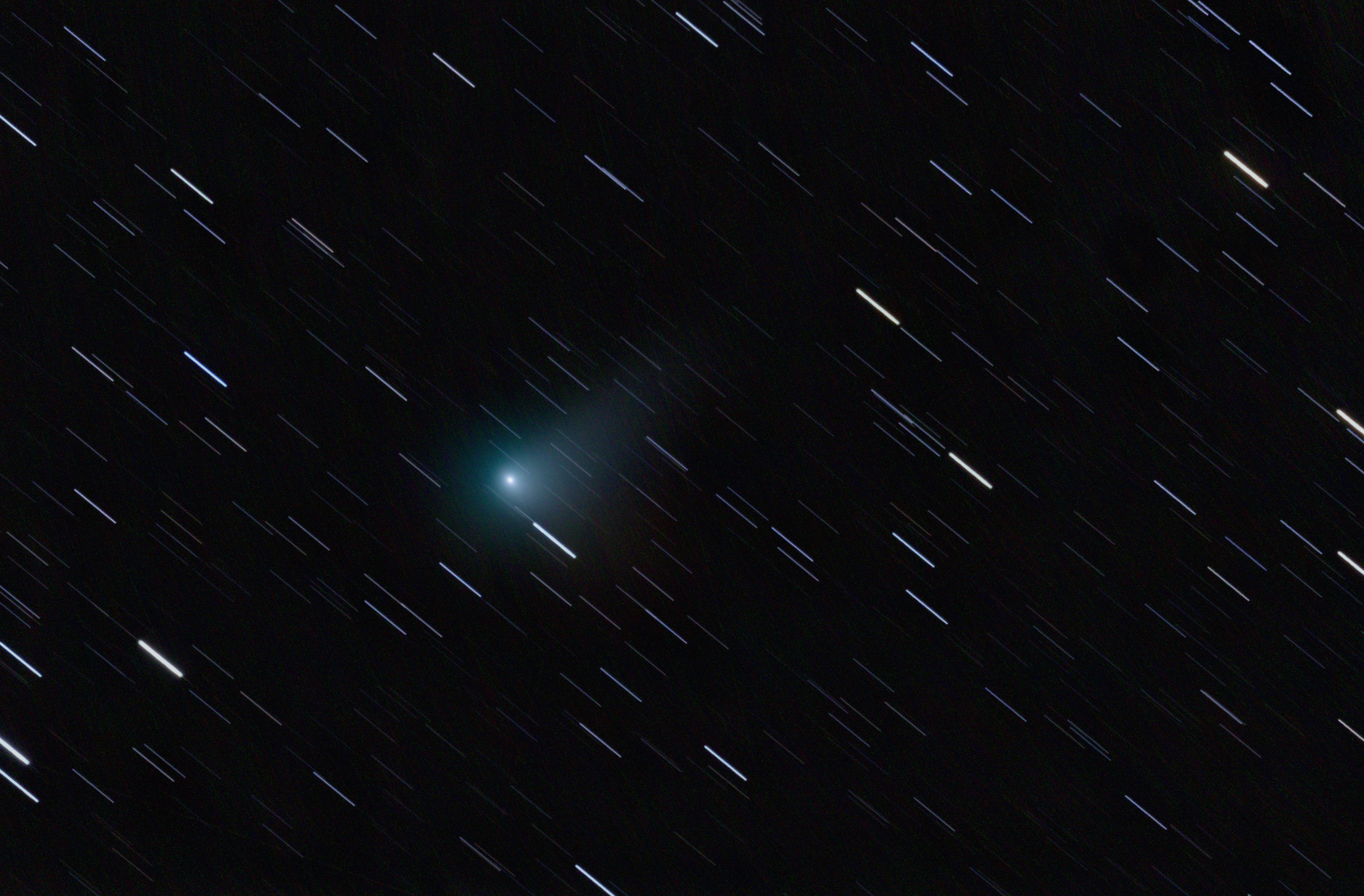Dieser kurzperiodische Komet ist einer der wenigen, der die Erwartungen deutlich übertroffen hat. Bei der prognostizierten Helligkeit von 10m bis 11m ist es nicht geblieben. Diese stieg auf deutlich mehr als 6m an, sodass dieser Komet sogar ein Fernglasobjekt wurde. Hinzu kam, dass er bei langsam abnehmender Helligkeit nahezu die ganze Nacht zu beobachten war. Leider gibt es aber auch eine weniger gute Nachricht. Die Helligkeit verteilte sich über eine sehr große Fläche. So war der Komet im Fernglas nur als schwach sichtbares, diffuses Nebelwölkchen zu erkennen. In der lang belichteten Aufnahme ist die Ursache zu sehen. Die Koma ist riesig, wahrscheinlich noch viel größer, als in der Aufnahme sichtbar. Der winzige Schweif ist darin kaum auszumachen.