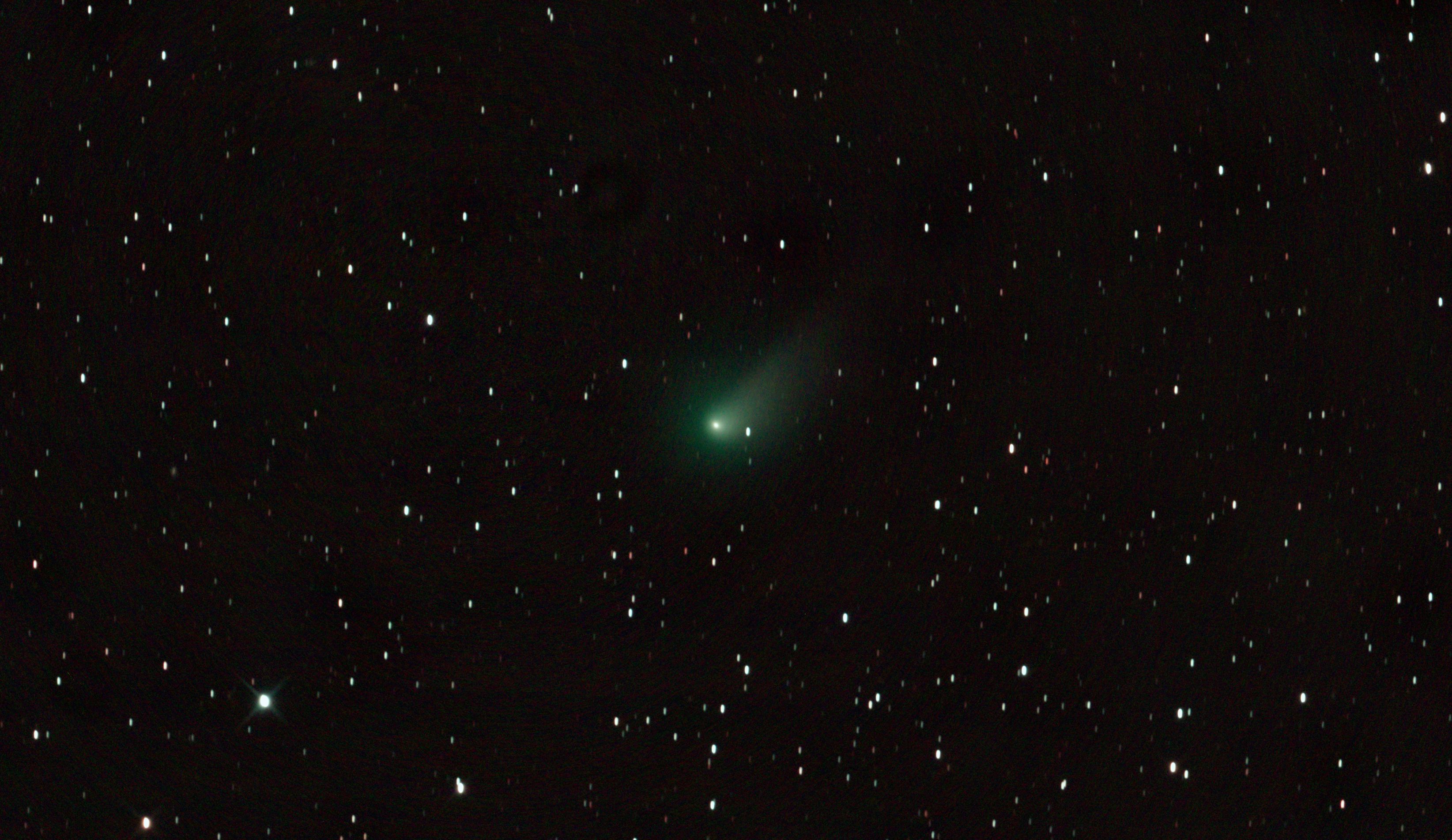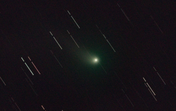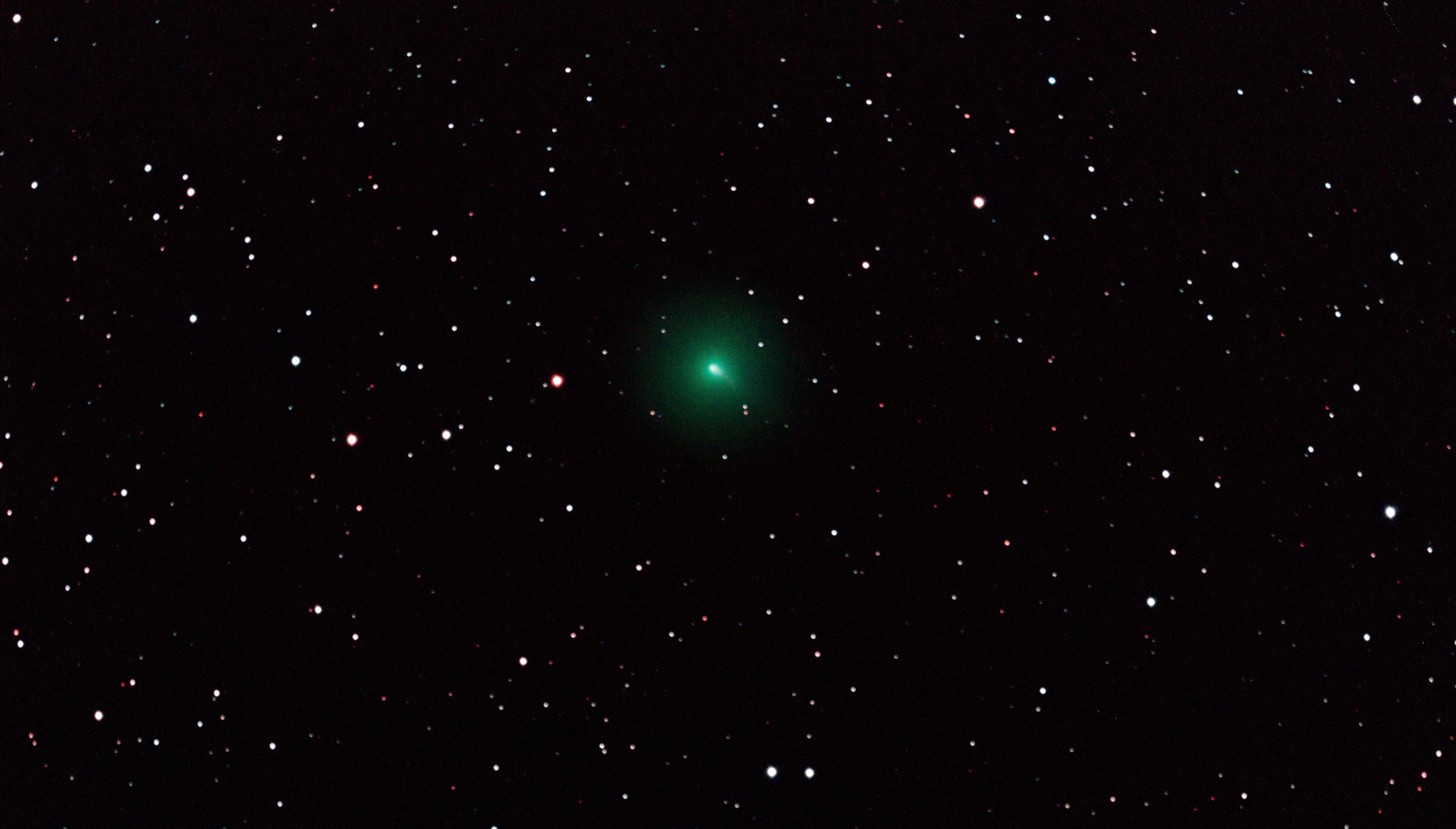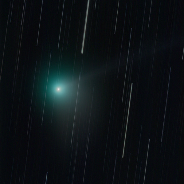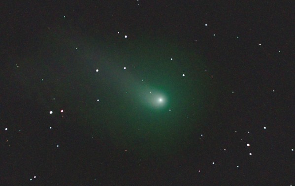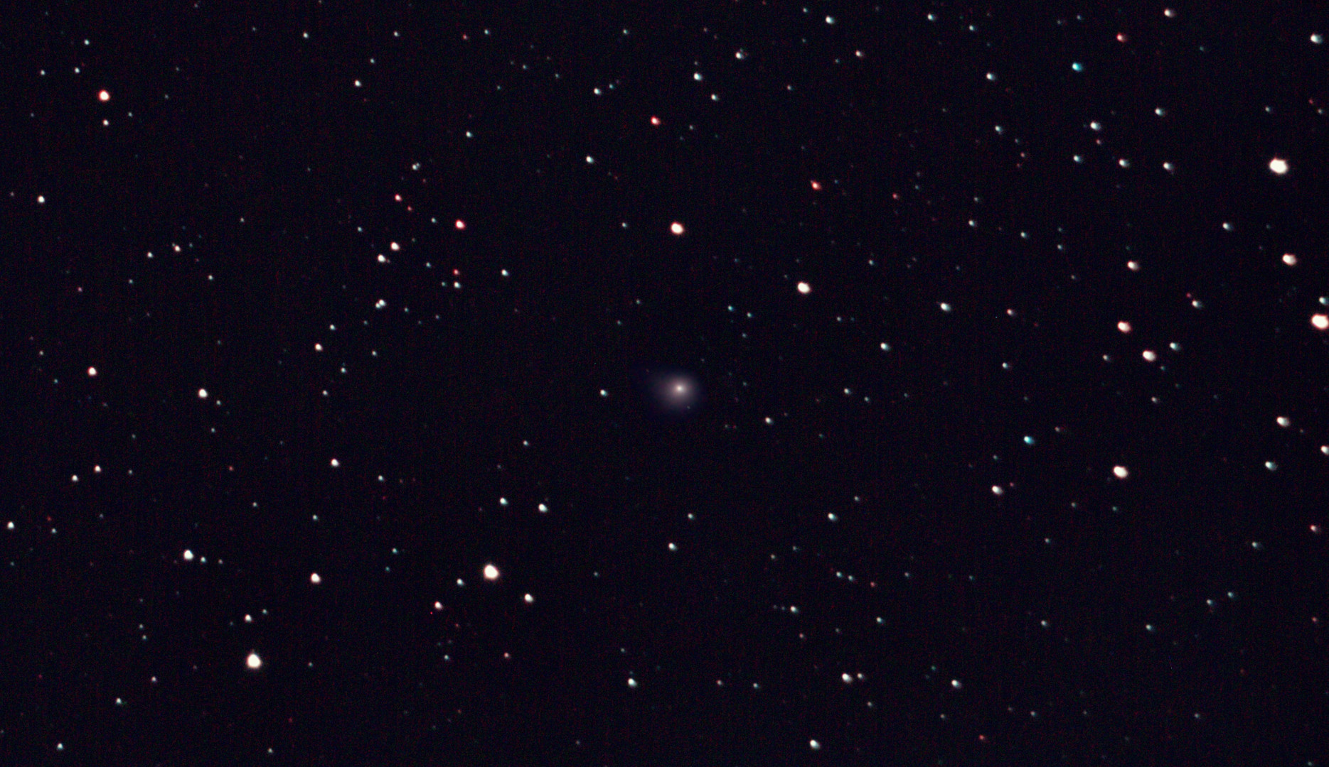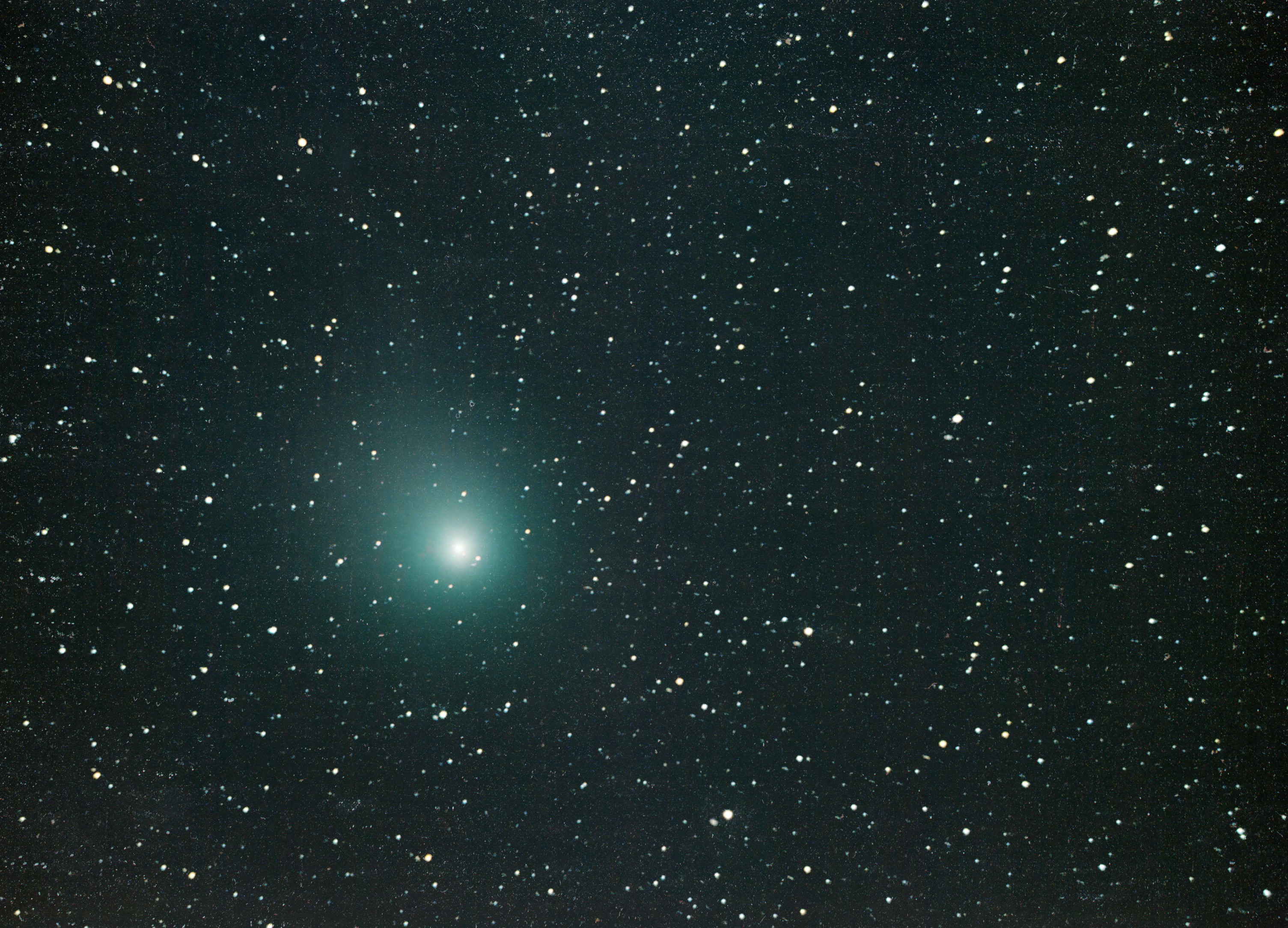 Dieser kurzperiodische Komet ist einer der wenigen, der die Erwartungen deutlich übertroffen hat. Bei der prognostizierten Helligkeit von 10m bis 11m ist es nicht geblieben. Diese stieg auf deutlich mehr als 6m an, sodass dieser Komet sogar ein Fernglasobjekt wurde. Hinzu kam, dass er bei langsam abnehmender Helligkeit nahezu die ganze Nacht zu beobachten war. Leider gibt es aber auch eine weniger gute Nachricht. Die Helligkeit verteilte sich über eine sehr große Fläche. So war der Komet im Fernglas nur als schwach sichtbares, diffuses Nebelwölkchen zu erkennen. In der lang belichteten Aufnahme ist die Ursache zu sehen. Die Koma ist riesig, wahrscheinlich noch viel größer, als in der Aufnahme sichtbar. Der winzige Schweif ist darin kaum auszumachen.