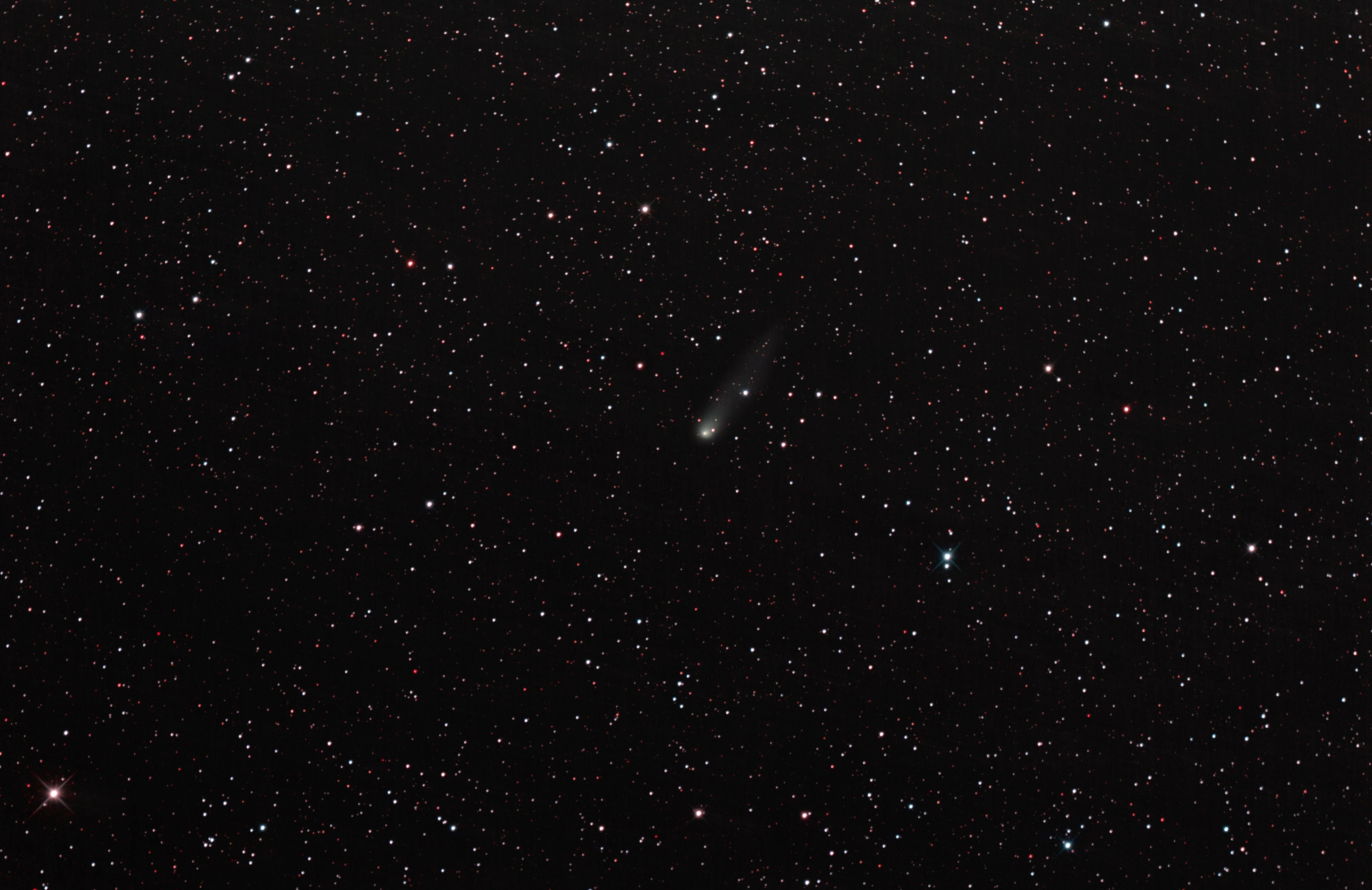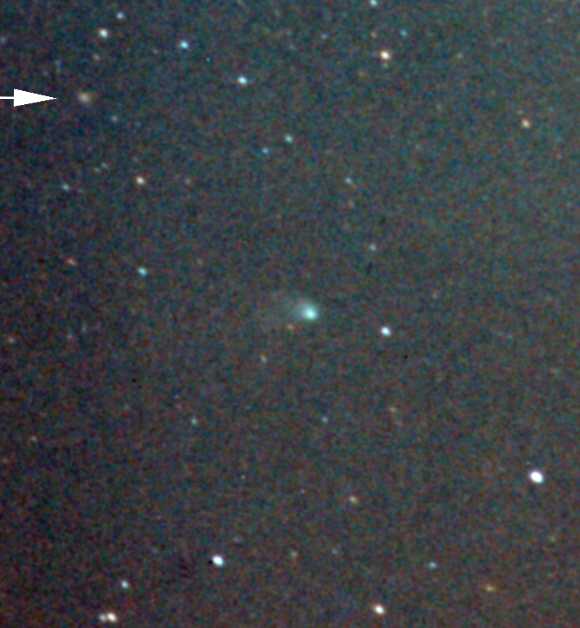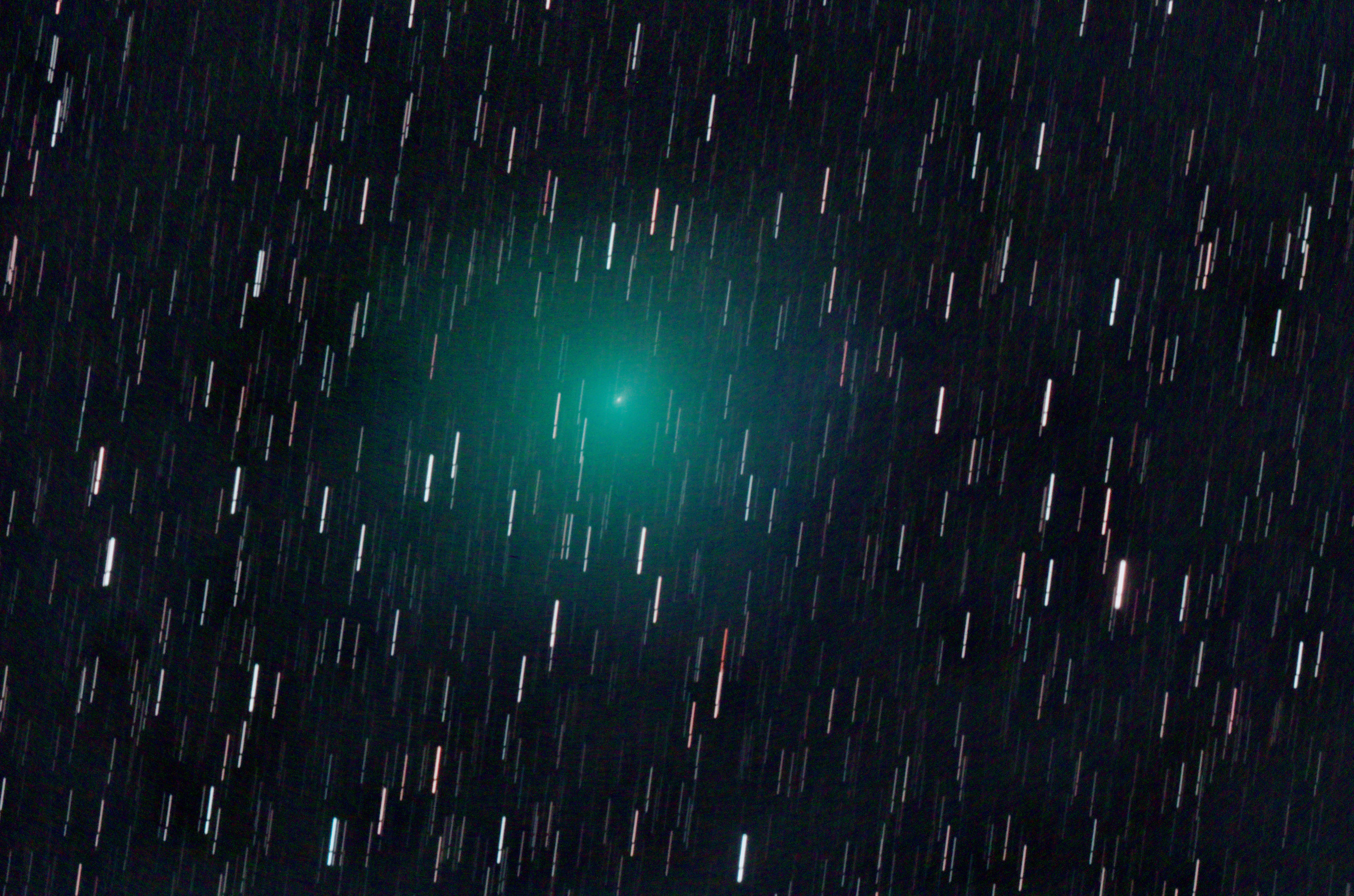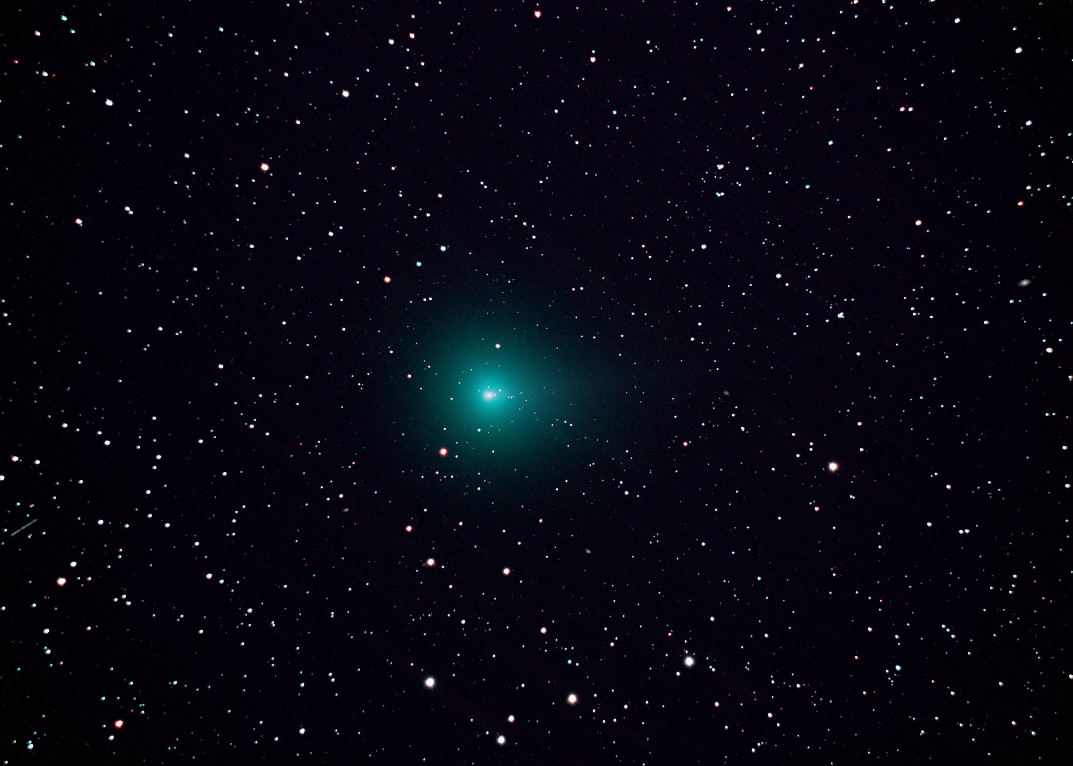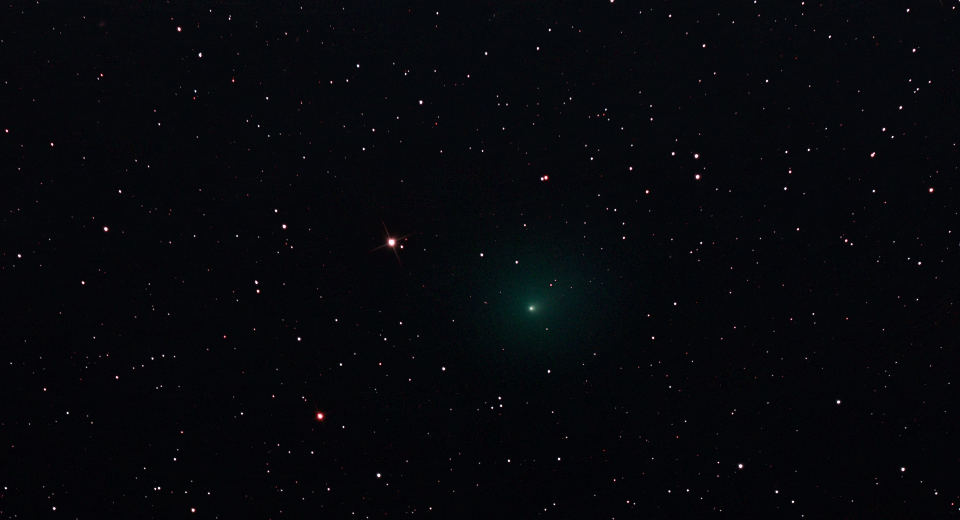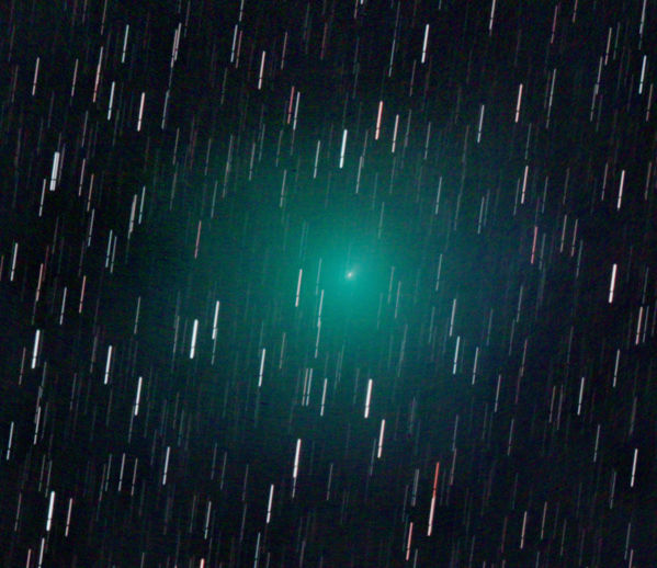 Dieser kurzperiodische Komet ist einer der wenigen, der die Erwartungen deutlich übertroffen hat. Bei der prognostizierten Helligkeit von 10m bis 11m ist es nicht geblieben. Diese stieg auf deutlich mehr als 6m an, sodass dieser Komet sogar ein Fernglasobjekt wurde. Hinzu kam, dass er bei langsam abnehmender Helligkeit nahezu die ganze Nacht zu beobachten war. Leider gibt es aber auch eine weniger gute Nachricht. Die Helligkeit verteilte sich über eine sehr große Fläche. So war der Komet im Fernglas nur als schwach sichtbares, diffuses Nebelwölkchen zu erkennen. In der lang belichteten Aufnahme ist die Ursache zu sehen. Die Koma ist riesig, wahrscheinlich noch viel größer, als in der Aufnahme sichtbar. Der winzige Schweif ist darin kaum auszumachen.