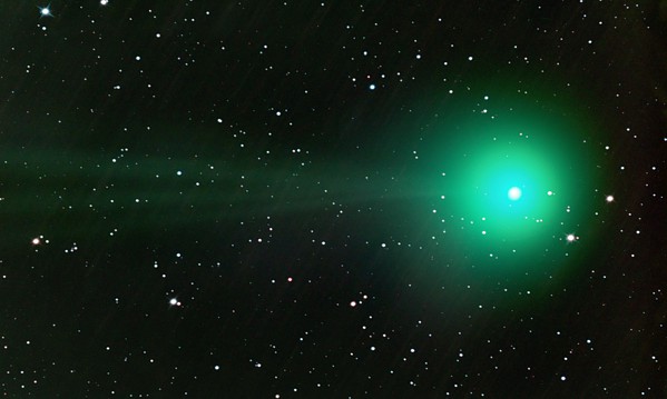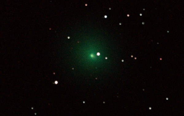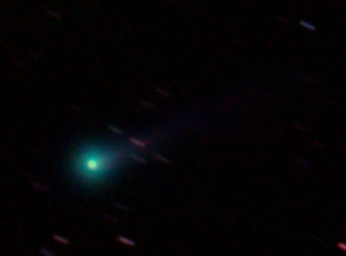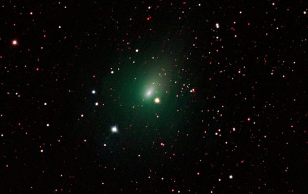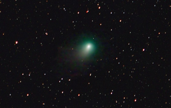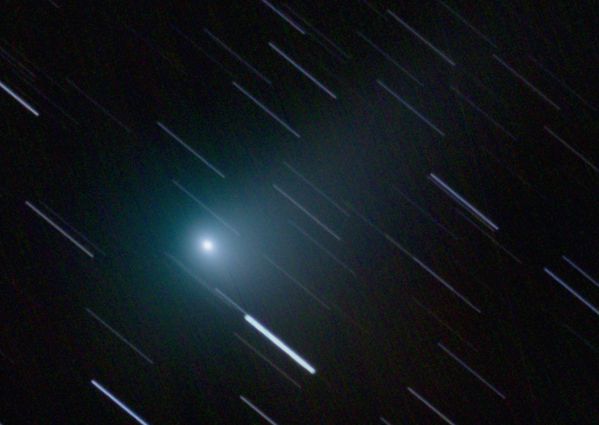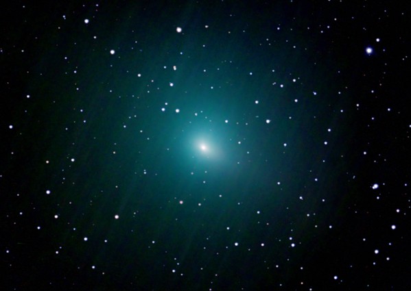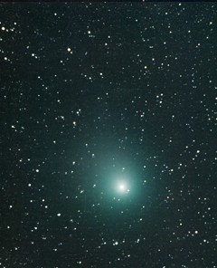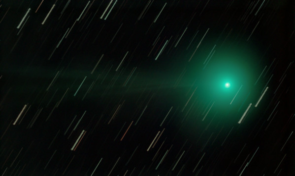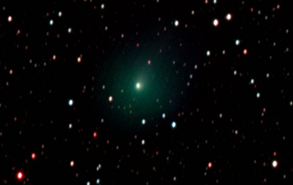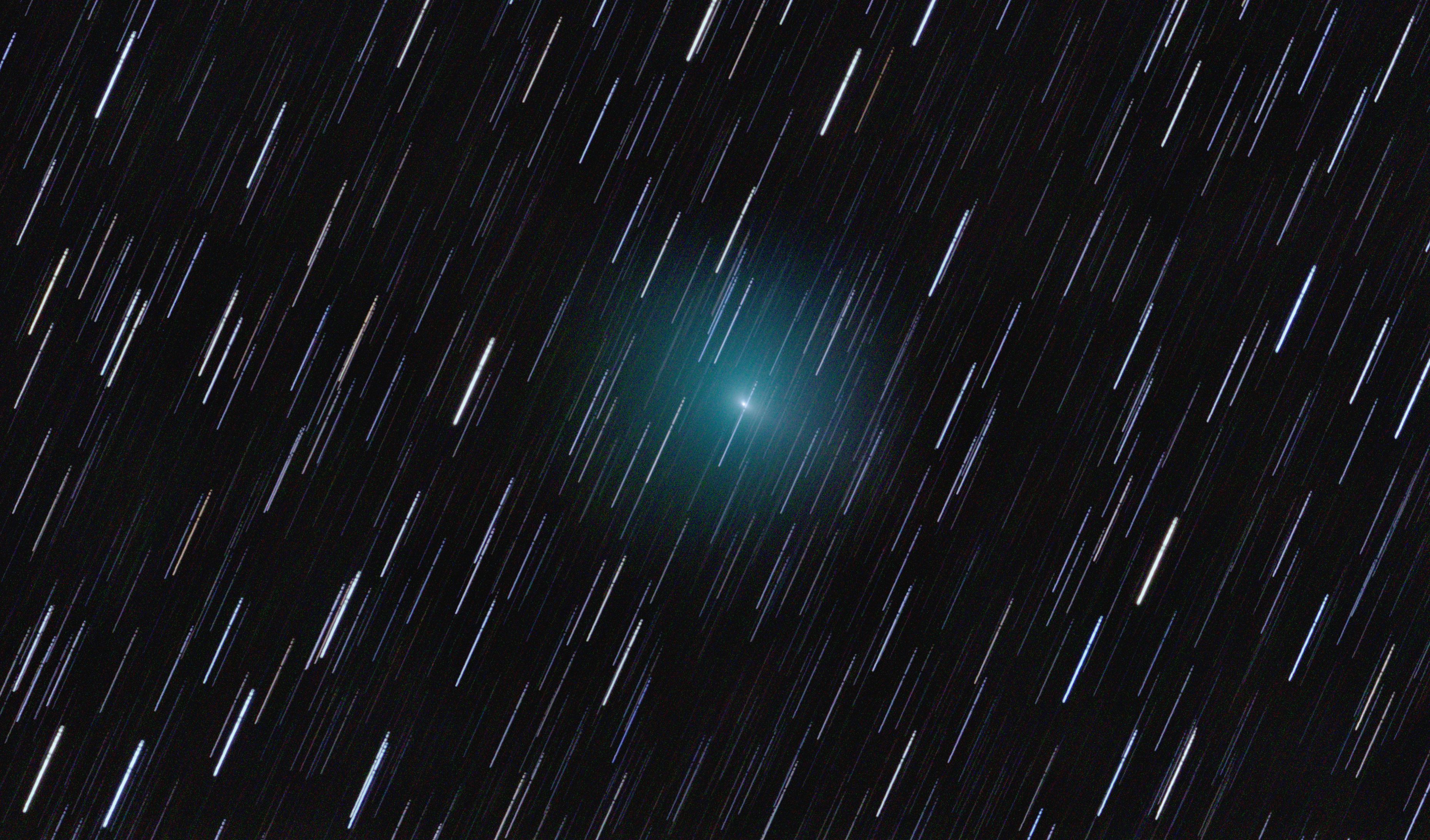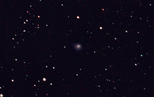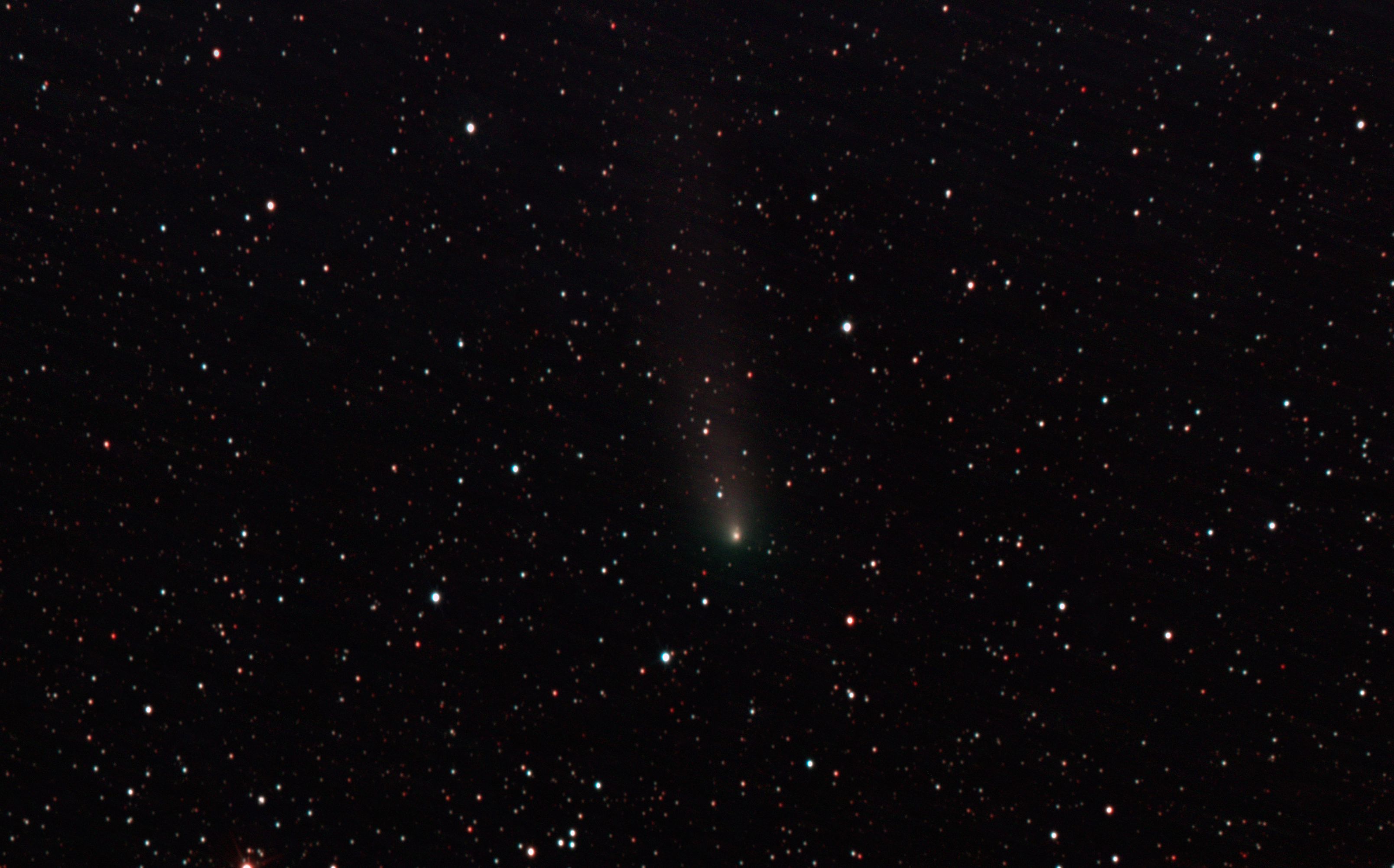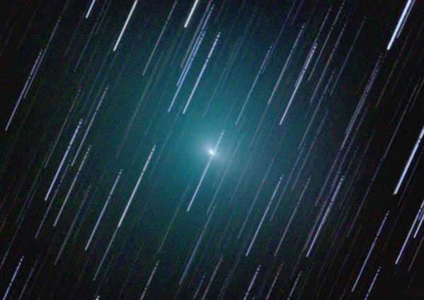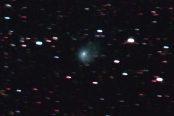 Dieser kurzperiodische Komet ist einer der wenigen, der die Erwartungen deutlich übertroffen hat. Bei der prognostizierten Helligkeit von 10m bis 11m ist es nicht geblieben. Diese stieg auf deutlich mehr als 6m an, sodass dieser Komet sogar ein Fernglasobjekt wurde. Hinzu kam, dass er bei langsam abnehmender Helligkeit nahezu die ganze Nacht zu beobachten war. Leider gibt es aber auch eine weniger gute Nachricht. Die Helligkeit verteilte sich über eine sehr große Fläche. So war der Komet im Fernglas nur als schwach sichtbares, diffuses Nebelwölkchen zu erkennen. In der lang belichteten Aufnahme ist die Ursache zu sehen. Die Koma ist riesig, wahrscheinlich noch viel größer, als in der Aufnahme sichtbar. Der winzige Schweif ist darin kaum auszumachen.
