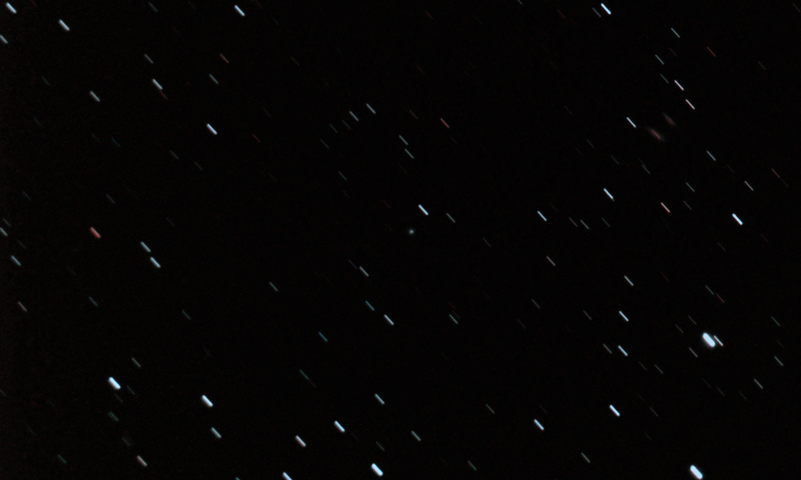 Zwei Wochen später hatte der Komet gerade einmal rund 0,5m an Helligkeit zugenommen. Ja, er war ein wenig besser zu erkennen, aber der Unterschied ist noch recht gering. Aufgrund der nur geringen Winkelgeschwindigkeit des Kometen am Himmel wäre es auch hier zu aufwändig gewesen, die Aufnahme so zu bearbeiten, dass die Sterne am Ende punktförmig erscheinen.