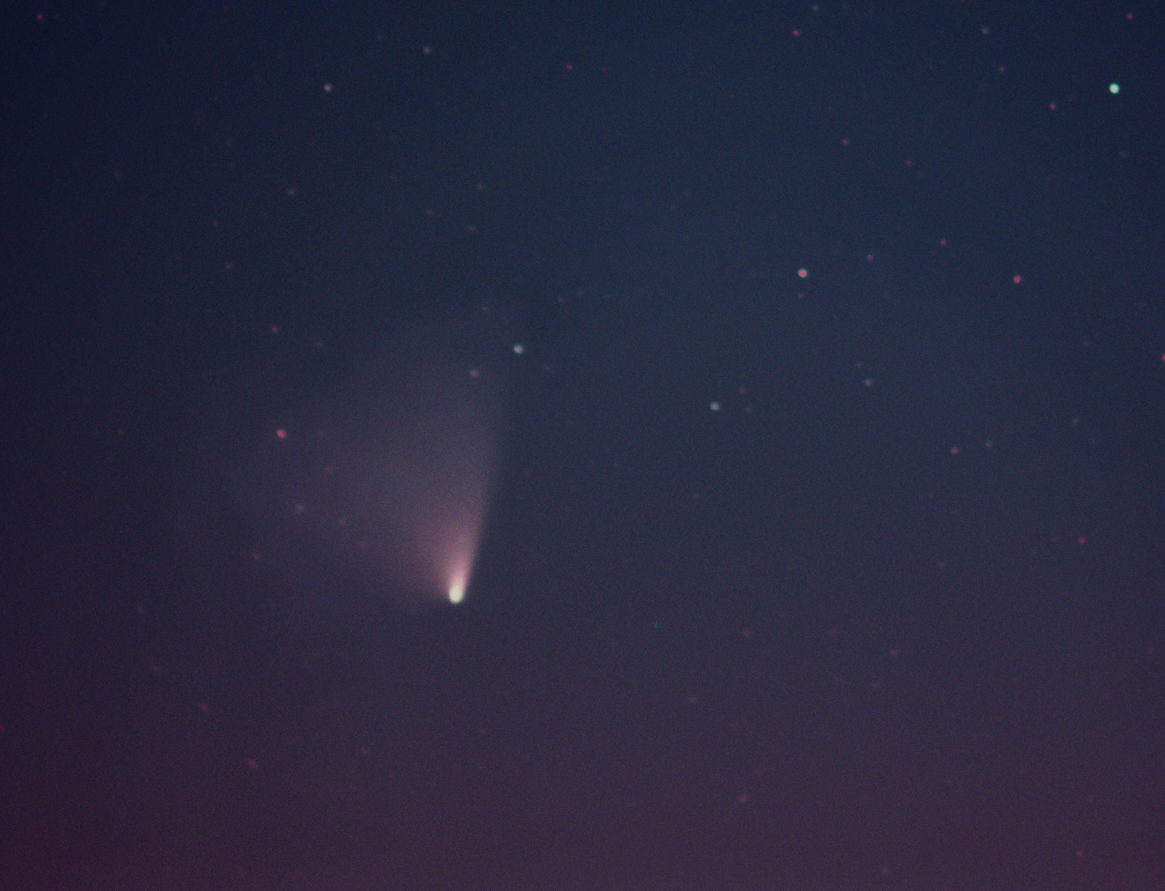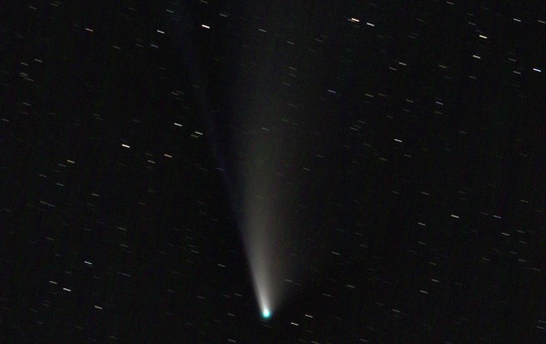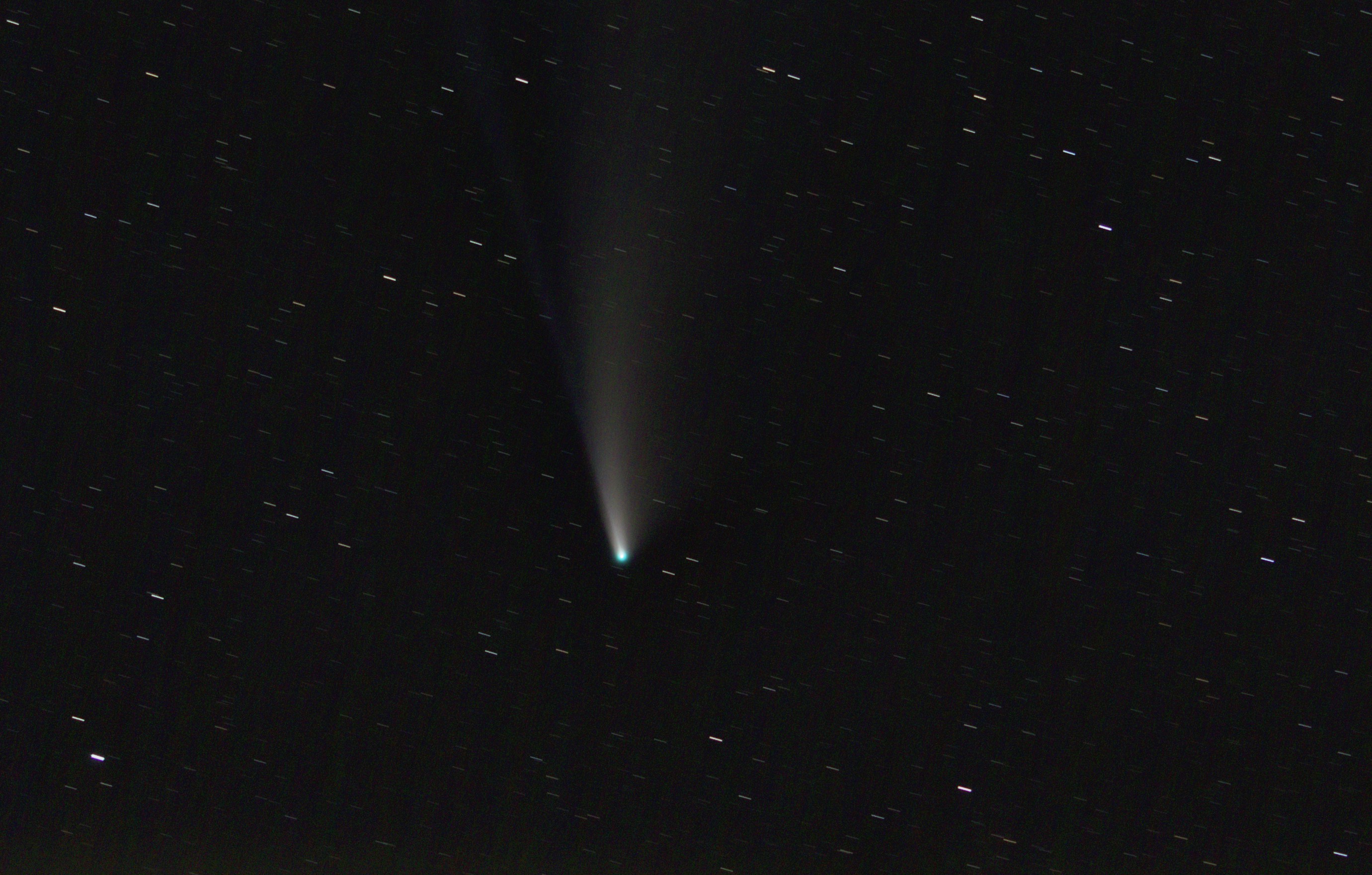 Komet C/2020 F3 (NEOWISE) am 29.7.2020, 870 Aufnahmen je 6s mit Canon EOS 1100Da und Teleobjektiv 250 mm bei 6400 ASA, addiert mit Fitswork |