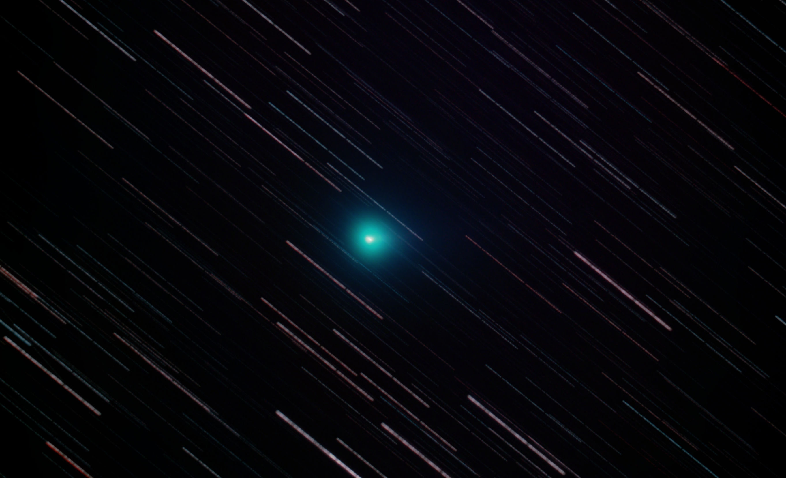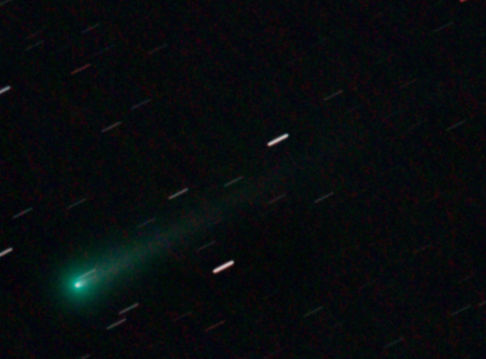 Die Winkelgeschwindigkeit des Kometen hat inzwischen ebenfalls zugenommen, was bereits an den längeren Strichspuren der Sterne in der Aufnahme erkennbar ist. Die Zeitrafferaufnahme macht es ebenfalls deutlich. Sie zeigt mehr als 2 Stunden in 11s.
