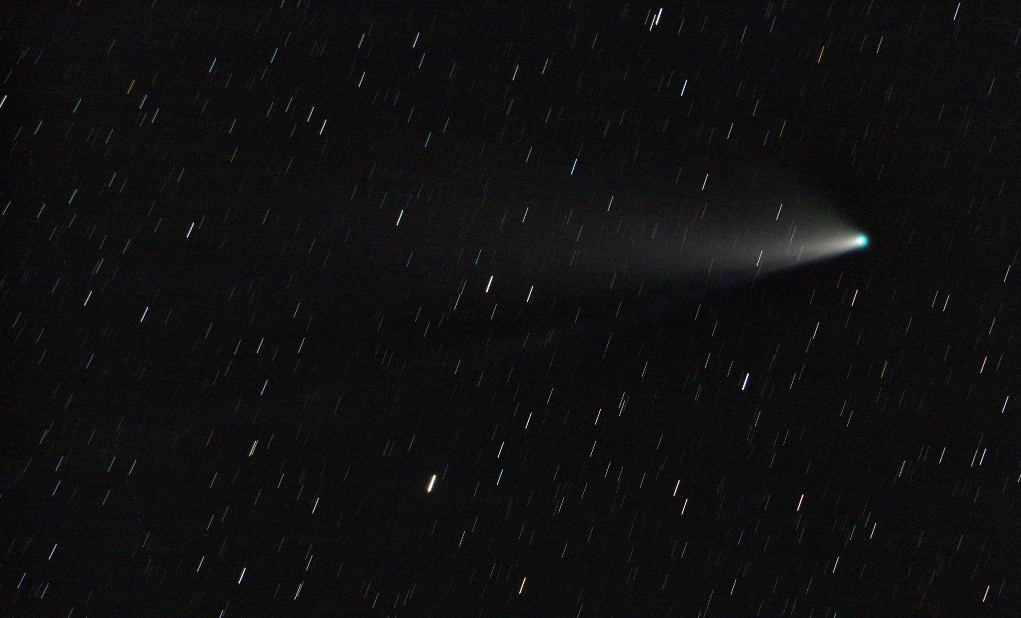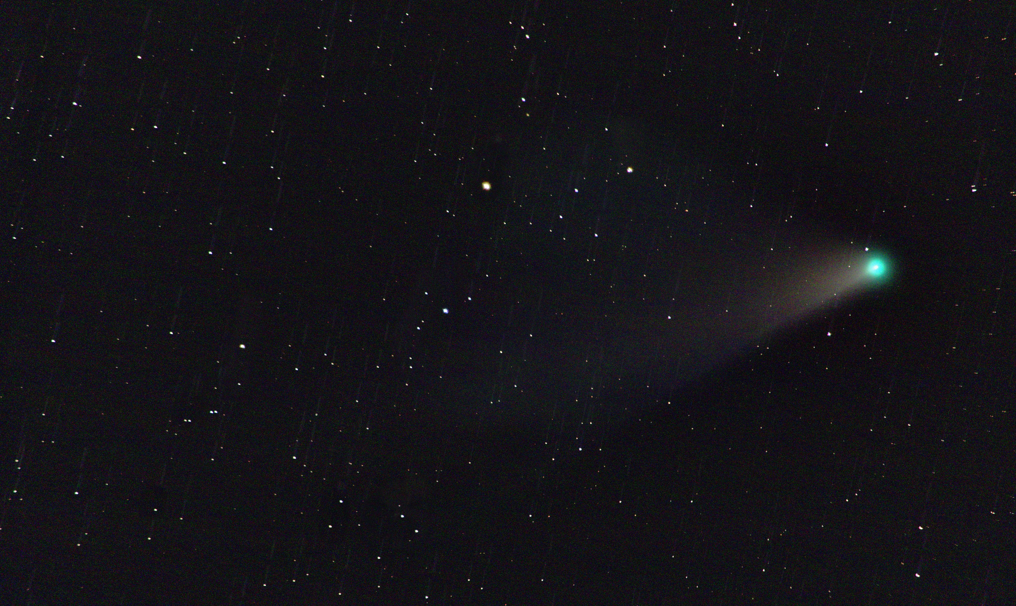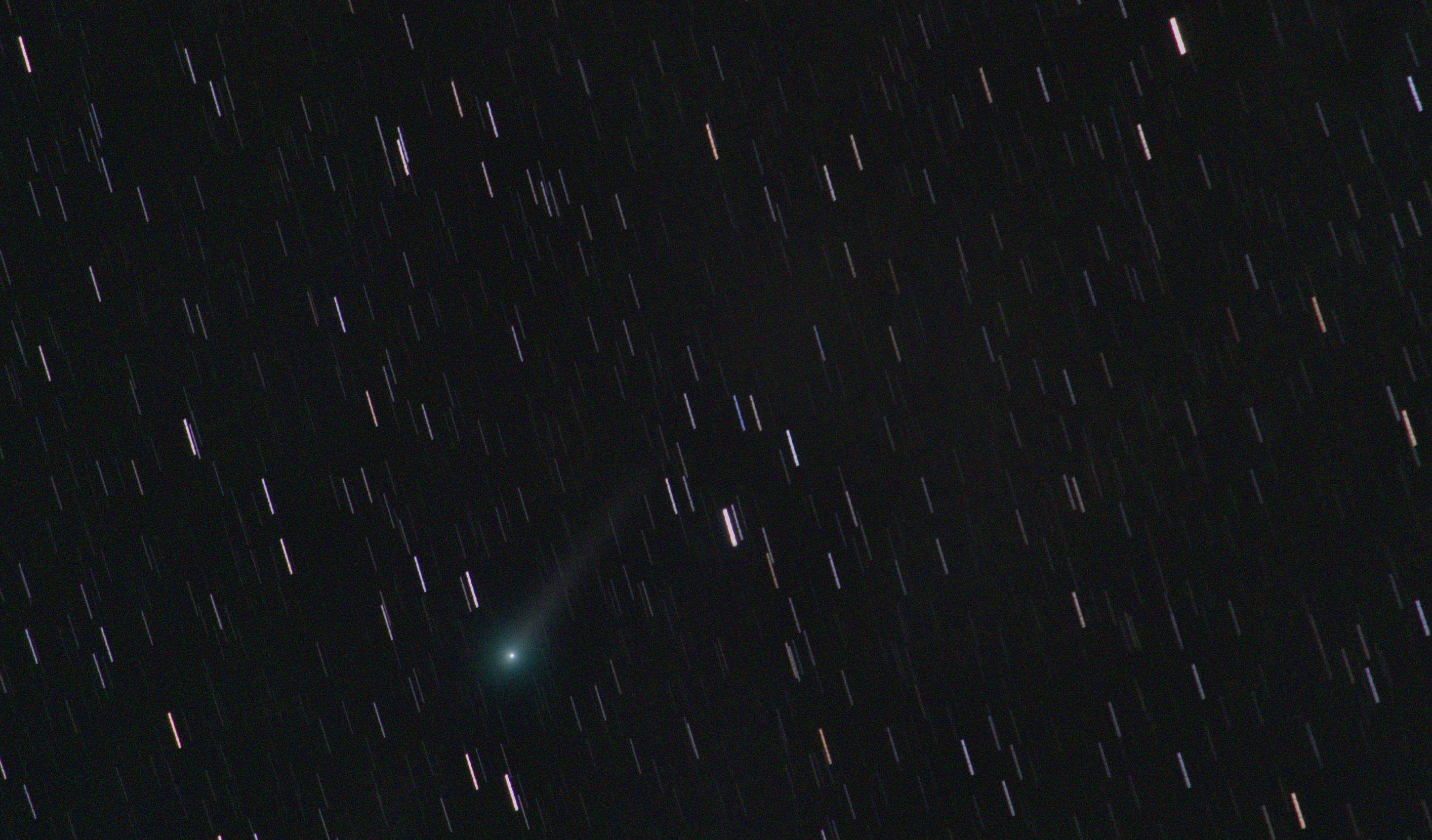 Zwei Tage später war der Himmel wieder klar und der Komet hatte gerade seinen erdnächsten Punkt in etwa 100 Millionen km Entfernung passiert. So nahm ich den Kometen erneut ins Visier. In diesem Fall verwendete ich ein Teleobjektiv mit 100 mm Brennweite, um ihn noch ein wenig größer darzustellen. Weiterhin erhöhte ich die Gesamtbelichtungszeit auf etwa 2 Stunden.