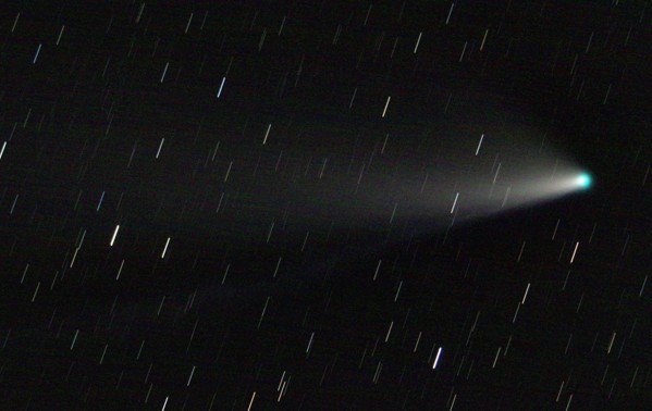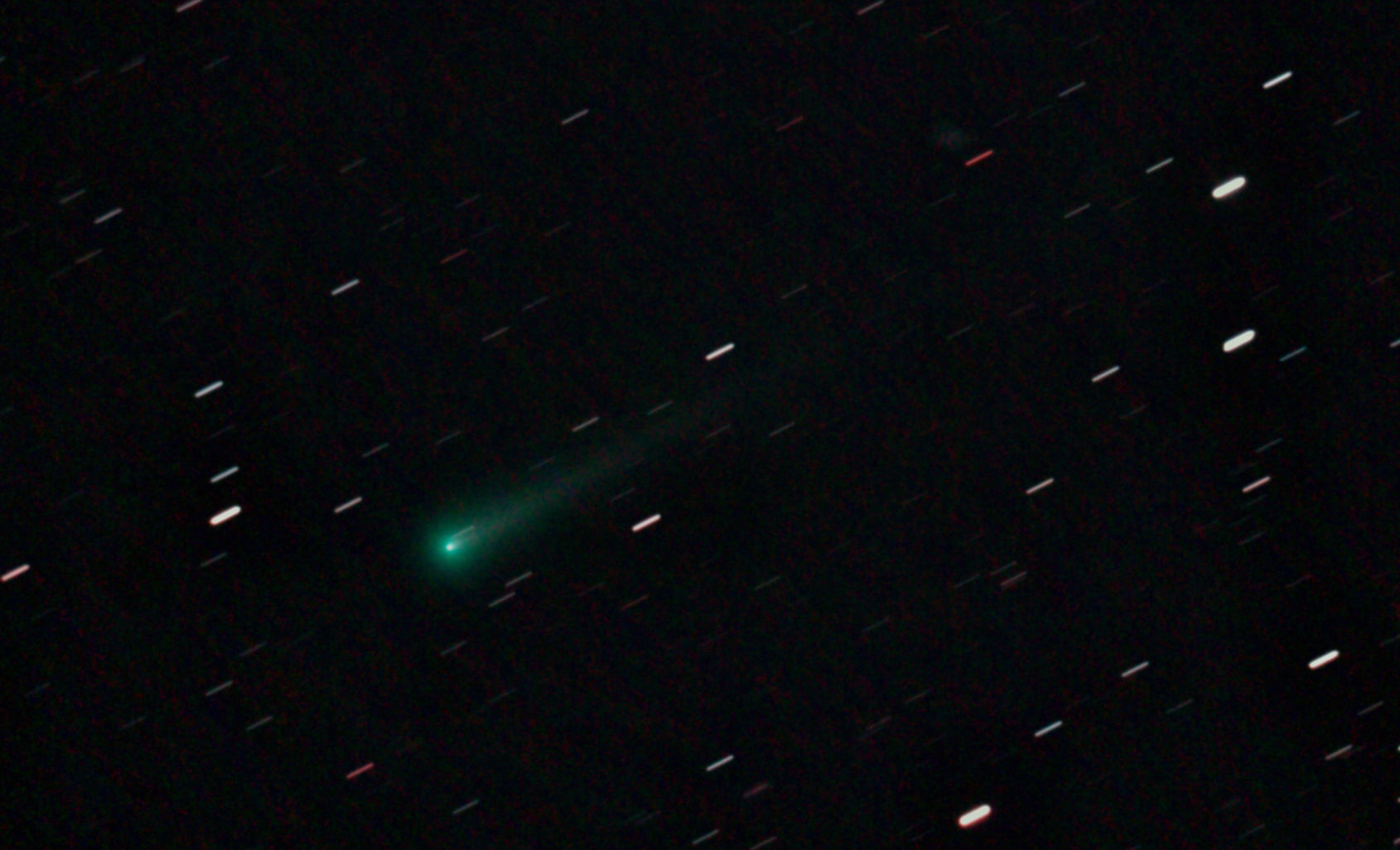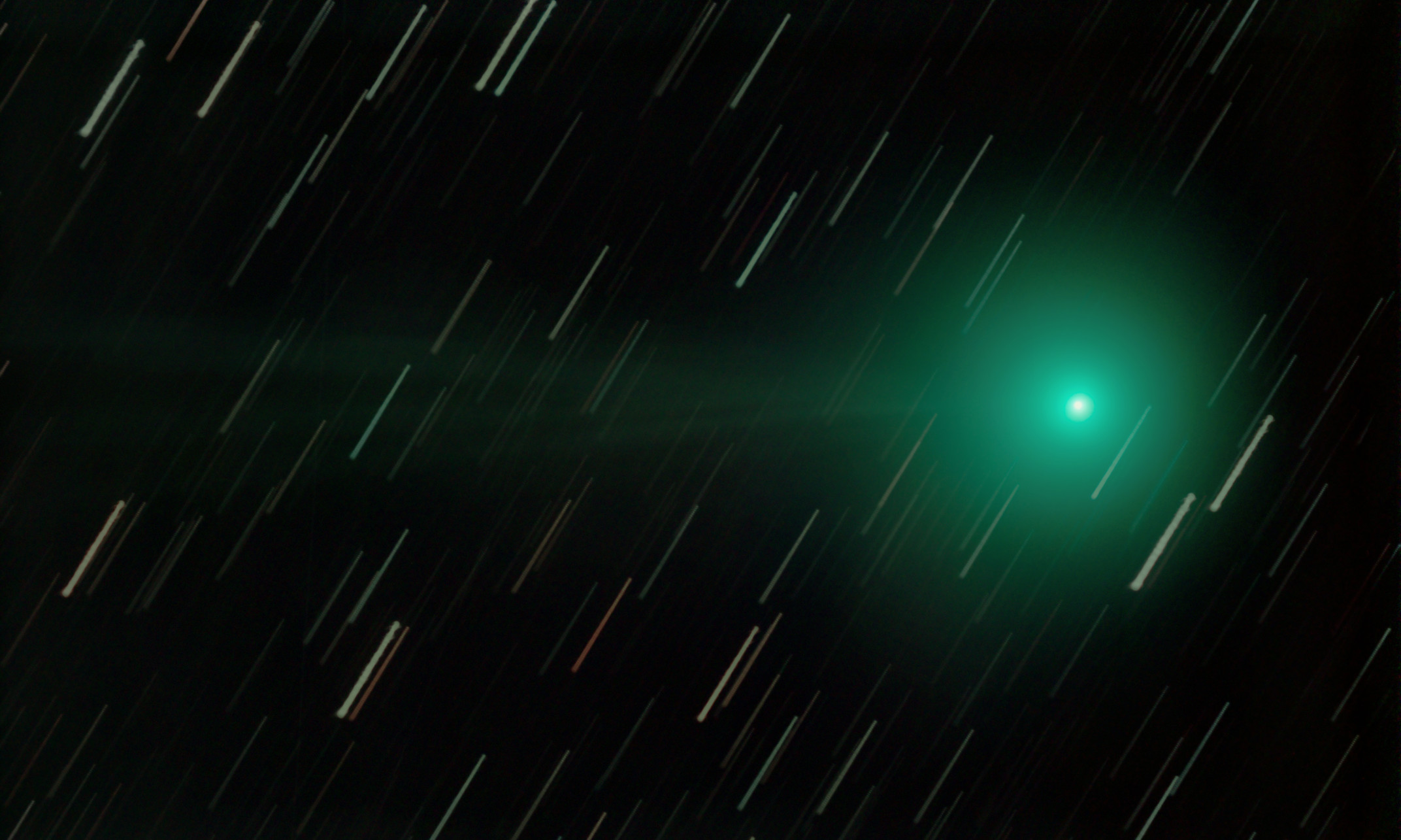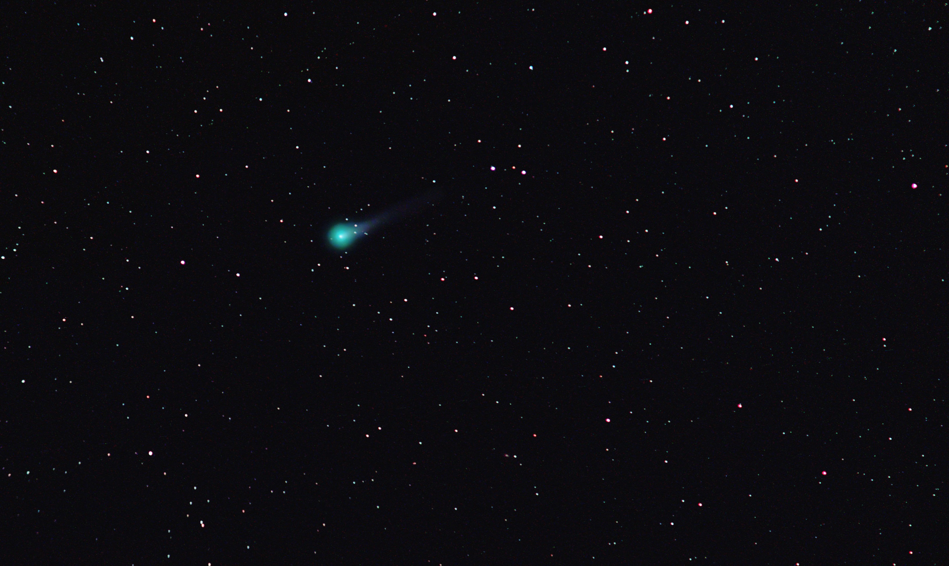 Zwei Tage später war der Himmel wieder klar und der Komet hatte gerade seinen erdnächsten Punkt in etwa 100 Millionen km Entfernung passiert. So nahm ich den Kometen erneut ins Visier. In diesem Fall verwendete ich ein Teleobjektiv mit 100 mm Brennweite, um ihn noch ein wenig größer darzustellen. Weiterhin erhöhte ich die Gesamtbelichtungszeit auf etwa 2 Stunden.