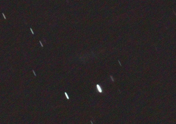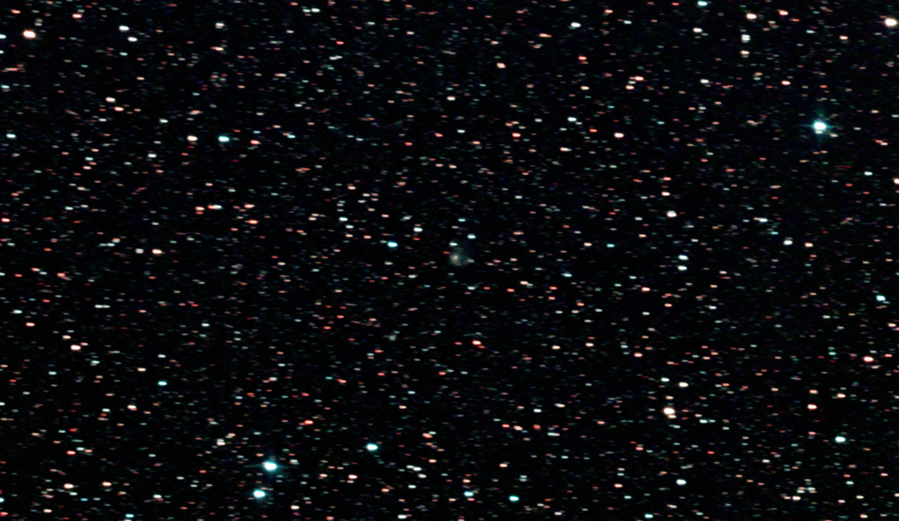 Dieser Komet hat eine Periode von knapp fünfeinhalb Jahren. Da er mit einer Helligkeit von 9,5m geführt wurde, war ich sehr zuversichtlich, was die Aufnahmen betraf. In den Rohbildern sah ich den Kometen erst mal nicht. Gut, das ist nicht selten. Leider zogen dann auch noch Zirrus-Wolken durch das Bild, sodass ich die Aufnahmeserie nach einer Stunde abbrechen musste. Als ich dann aber die Auswertung durchführte fand ich immer noch keinen Hinweis auf den Kometen. Ich prüfte die Aufnahmekoordinaten. Sie waren in Ordnung. So übernahm ich die Koordinaten zur Berechnung der Kometennachführung in Fitswork aus der Astronomie-Software. Ich nutzte verschiedene Wege und erhielt am Ende mehrere Ergebnisse. Erst mal sah ich nichts. Aber bei genauerer Betrachtung fiel mir eine kaum merkliche Aufhellung auf. Nach starker Nachbearbeitung wurde diese Aufhellung etwas deutlicher, blieb aber dennoch kaum wahrnehmbar. Aber ich bin sicher, das muss der Komet sein. Wenige Tage später wurde der Komet mit einer Helligkeit von 12m angegeben. Aber auch das scheint mir recht optimistisch.