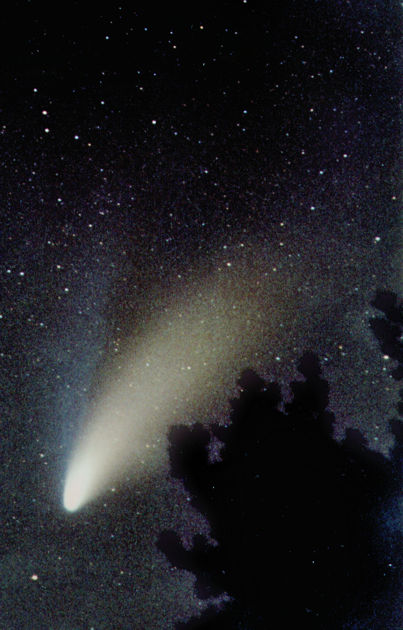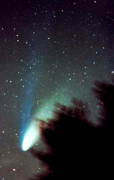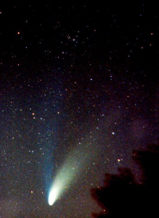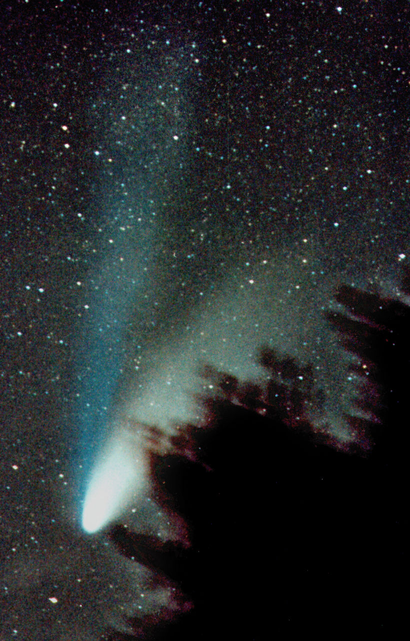 Kometen von dieser Helligkeit sind selten. Dennoch konnte man bereits ein Jahr zuvor den Kometen Hyakutake am Himmel bewundern. Hyakutake war viel größer am Himmel zu sehen aber dafür nicht so hell. Hale Bopp war durch seine große Helligkeit auch unter ungünstigen Bedingungen zu sehen. Auf den Bildern ist der bläuliche Gasschweif, den man mit bloßem Auge nicht erkennen konnte, und der helle Staubschweif zu erkennen. Der Gasschweif zeigt immer direkt von der Sonne weg. |