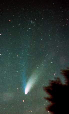 Der helle Stern unter dem Kometen ist der Stern Almach im Sternbild Andromeda. Auf den 3 Aufnahmen von 1997 ist der Hintergrund recht hell, da sie noch in der Dämmerung gemacht wurden. Doch später verschwand der Komet in einem Baum, wie es rechts oben zu sehen ist.